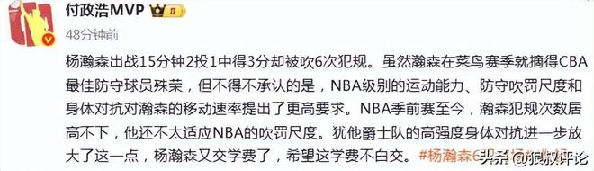 媒体人付政浩发文点评:虽然瀚森在菜鸟赛季就摘得CBA最佳防守球员殊荣,但不得不承认的是,NBA级别的运动能力、防守吹罚尺度和身体对抗对瀚森的移动速率提出了更高要求。